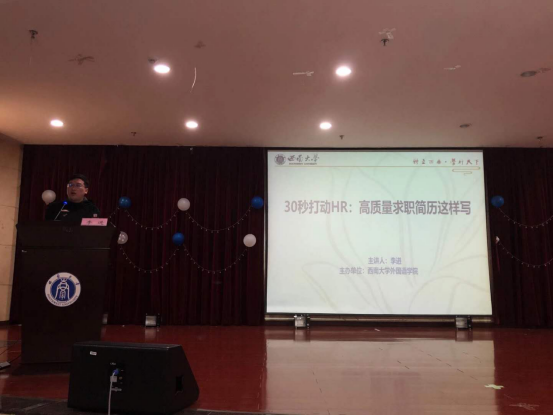 随后,西南大学生涯咨询师、体育学院组织员李进老师作了题为“30秒打动HR:高质量求职简历这样写”的培训讲座。李老师从聚焦HR需求、拒绝一稿多投、凸显职业能力、深度挖掘成就、简历要素解析、语言高端大气、数据清晰可视、牢记底线思维等八个维度进行了讲解,同学们受益匪浅,收获颇多。