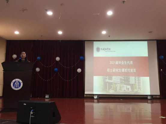 接着,2021届毕业生代表硕士研究生谭若竹同学发言。谭若竹从个人的学习经历出发,分享了自己自本科时期便坚定想当一名人民教师的职业梦想,同时感谢了学院老师及导师杨晓钰老师的谆谆教诲。谭若竹同学以两次成功的应聘经历为例,提出应聘教师首先要做到的便是角色的转变,其次是教态和口语的表达。同时她分享到,多次的失败亦是成功的基石,希望每位同学能够总结经验、保持自信,最终找到理想的工作。