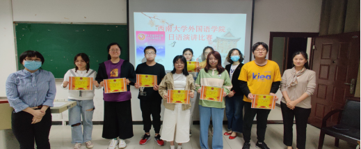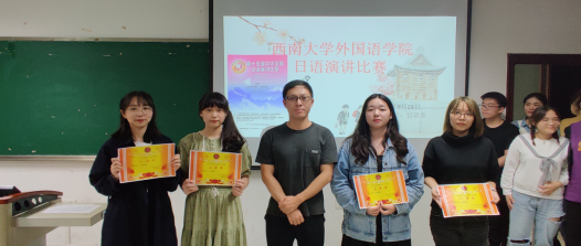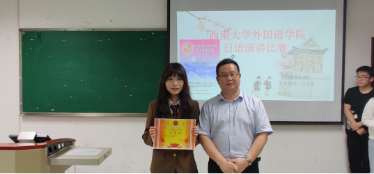经过激烈的角逐,2018级游千慧同学荣获一等奖;2017级钟悦获二等奖2019级吴睿和洪晨、2018级王曦分别荣获二等奖;2017级李明、沈可、王泽华,2018级朱雨薇、于展浩、2019级李忆莲、伍建生、张颂笛等同学获得三等奖。其中,游千慧同学将作为我校日语专业代表选手参加2020年11月1日由中国教育国际交流协会等主办、我校承办的“第十五届中华全国日语演讲比赛西南地区预赛”。