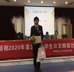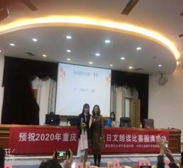 2020年11月21日,“重庆市大学生日文朗读比赛”在重庆师范大学弘德楼凯撒报告厅隆重举行。来自重庆大学、四川外国语大学、长江师范学院、三峡学院、川外南方翻译学院、重庆师范大学、西南大学等12所高校日语专业及非日语专业学生24名选手参赛。我院日语系2018级于展浩同学、2019级吴睿同学分别获得一等奖、2017级非师范英语专业姜文静获得非专业组二等奖。我院日语系彭玉全主任受邀到场代表中国日语教学研究会重庆分会在开幕式上致辞,日语系部分教师与学生20人前往比赛现场观摩学习,加油助威。