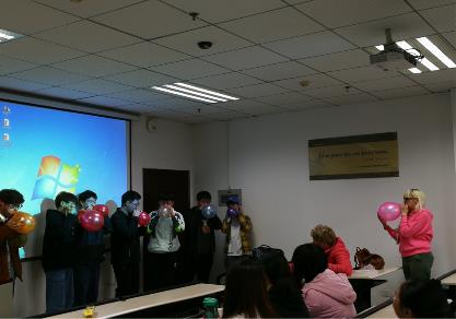 在师生游戏互动环节中,同学们以一场俄罗斯谢肉节的传统舞蹈拉近了彼此的距离,增进了彼此的感情,还在老师的引导下学习了俄罗斯传统歌曲。师生们载歌载舞,其乐融融,同学们愈发深入的体会到俄语的优美。最后,男生吹气球比赛压轴登场,伴随着同学们的尖叫声和气球的破裂声本次俄罗斯美食分享会圆满结束。