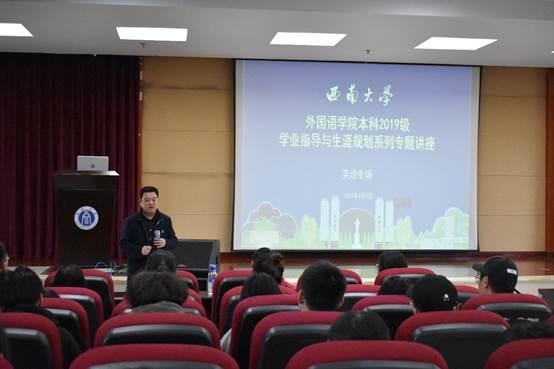 2021年4月9日下午,76net必赢官网于5教903成功举办 “脚踏实地,仰望星空——争做新时代外语人才”主题讲座,该讲座为76net必赢官网本科2019级学业指导与生涯规划系列专题讲座的英语专场。学院副院长褚修伟作主讲人,本科2019级辅导员许安琪和本科2019级英语专业全体学生聆听了本次讲座。