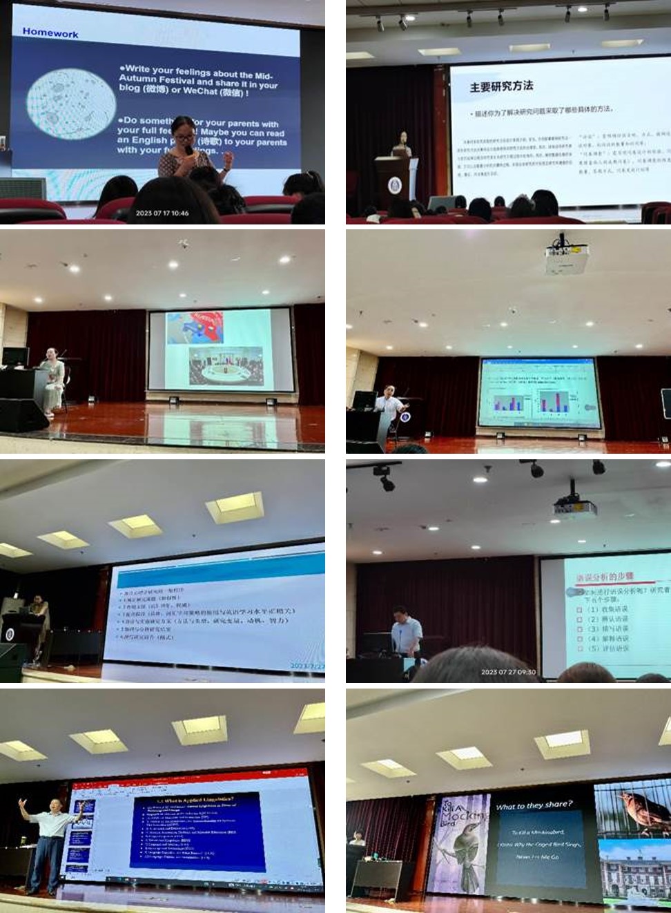 《英语语言文学研究专题》课程由刘承宇老师和李芳老师共同授课。刘承宇老师讲述了应用语言学的目的、范围、研究方法、心理语言学等专业知识,聚焦于二语习得、语言的教与学等问题上。同时,通过欣赏一篇优秀的期刊论文来启发学生们了解学术论文写作规范。最后,刘老师语重心长地勉励学生们不要做一头只会埋头拉磨的驴,而要做有远大目标并为之不懈努力的千里马,并以校友曹宗清老师为例,告诫学生作为一线教师,研究这条路是与教学息息相关,并且只有抱着“不唯上,不唯书,只唯实”的态度,在老师领进门后,自己潜心修行才能走得更远。李芳老师带领学生赏析《杀死一只知更鸟》《我知道为何笼中鸟在歌唱》《莫失莫忘》等经典文学名著,启发学生思考如何深度解析文学作品,如何去看文字背后的意义,并探讨如何运用到教学中。