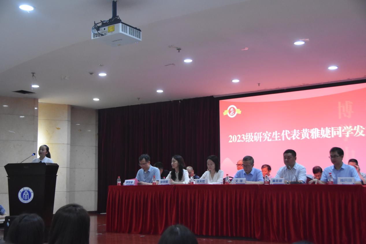 新生代表发言环节,2023级研究生代表黄雅婕号召同学们厚植家国情怀,勇担使命;秉承守望相助,青春同行;践行潜心修炼,学研并进!以奋发有为的状态追梦、逐梦、圆梦!