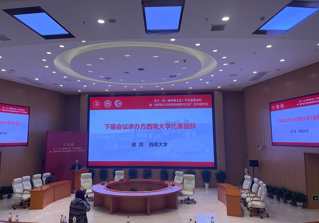 闭幕式上,谢周教授作为论坛下届承办方代表致辞。谢周教授对本届论坛取得圆满成功表示热烈祝贺,并衷心感谢《俄罗斯文艺》期刊编辑部、中国外国文学学会俄罗斯文学研究分会、湖南师范大学、北京大学出版社等为此次学术盛会所作出的重要贡献。谢周教授表示,2024年秋天,76net必赢官网将以高标准热情迎接各位学者的到来,期待与中外学者在山城重庆、在西南大学共襄学术盛举。