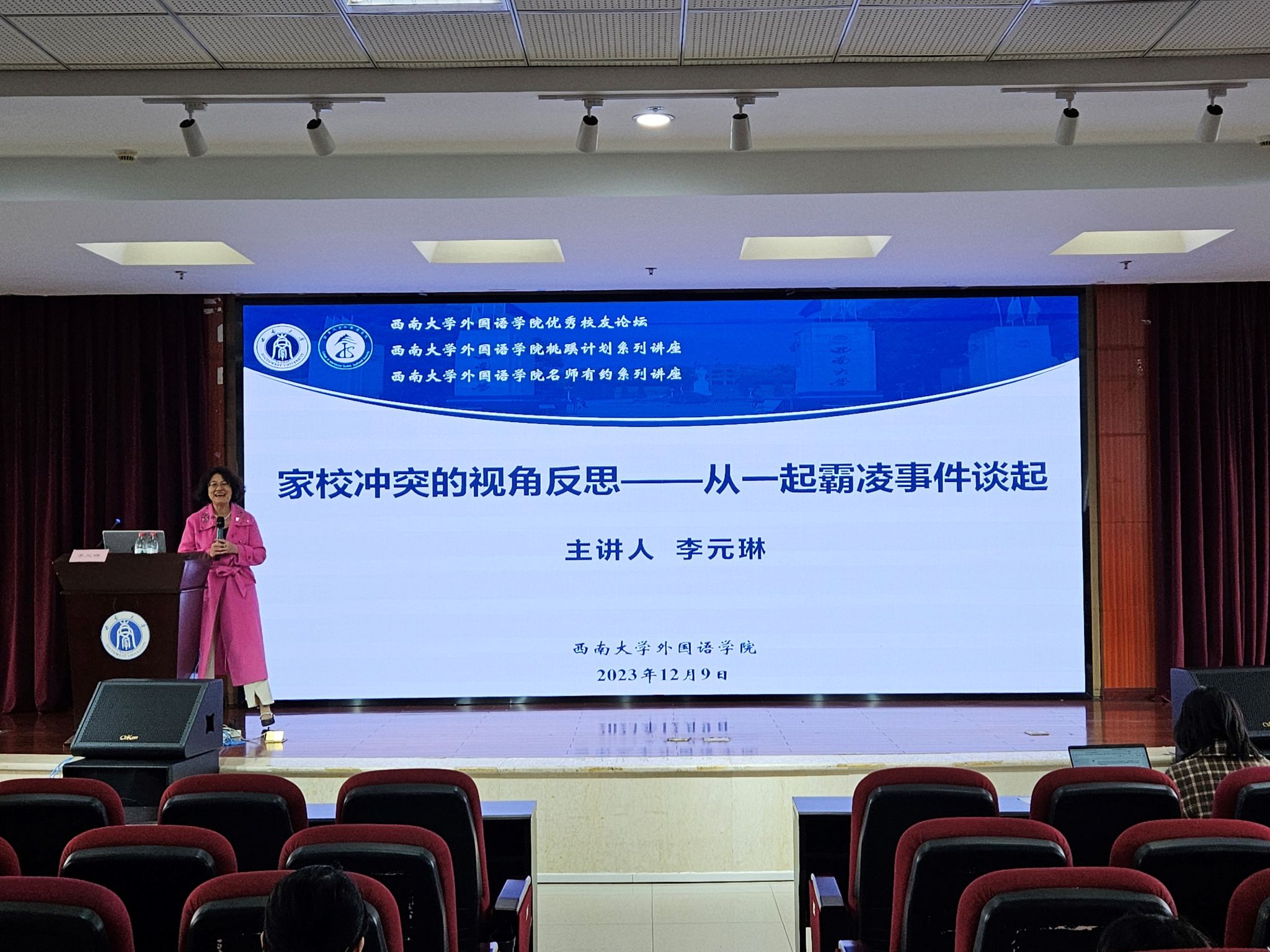 为深入学习贯彻习近平总书记关于教育的重要论述,切实落实立德树人根本任务,2023年12月9日,学院优秀校友、深圳市名班主任工作室主持人李元琳应邀做客桃蹊计划名师有约讲坛,做了题为“家校冲突的视角反思——从一起霸凌事件谈起”的班主任工作专题辅导报告。讲座由学院党委副书记梅胜利主持,学院辅导员王翠玉参加了讲座。