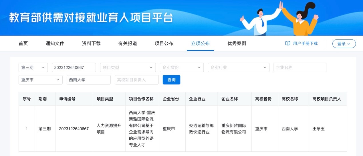 2024年6月14日,学院申报的“西南大学-重庆新雅国际物流有限公司基于企业需求导向的应用型外语专业人才”成功获批教育部第三期供需对接就业育人人力资源提升项目。
