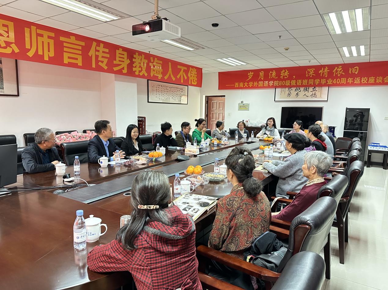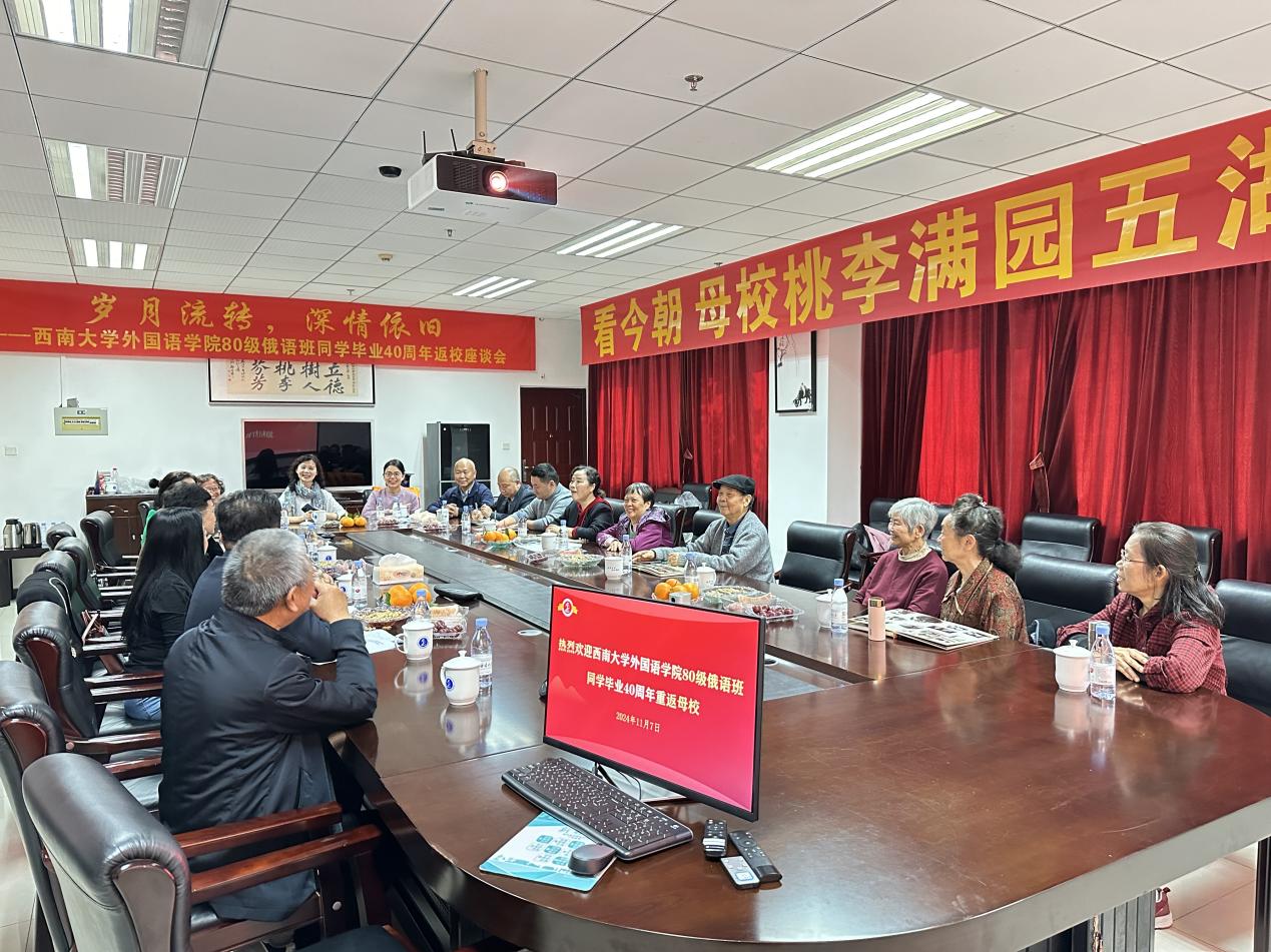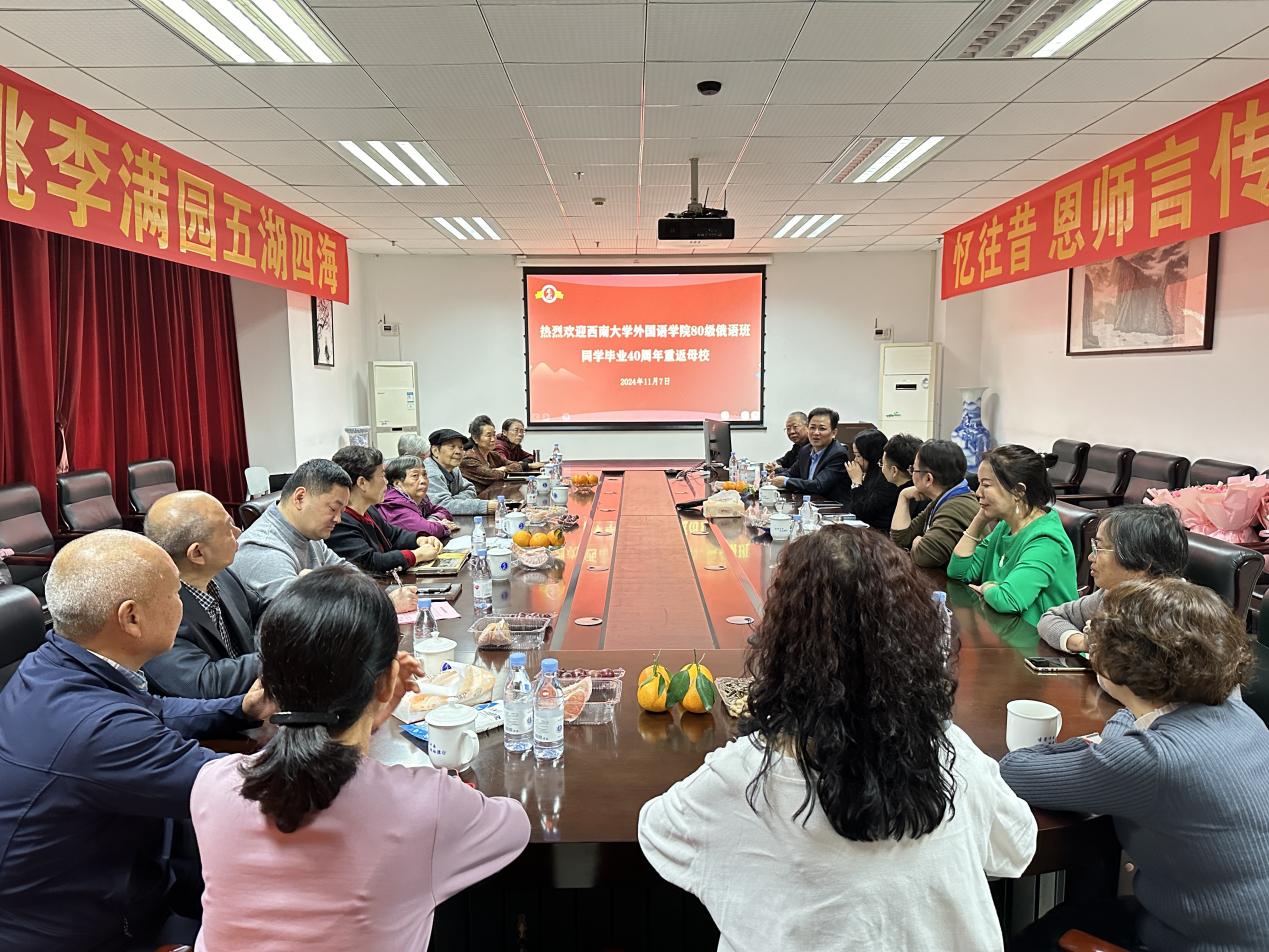 2024年11月7日上午,学院1980级俄语班同学毕业40周年返校座谈会在313会议举行。众多校友齐聚一堂,共同重温那段难忘的青春岁月,畅叙师生情谊,展望美好未来。学院党委书记严怡,学院关心下一代工作委员会副主任向雪琴,党委副书记梅胜利,俄语系主任谢周,俄语系退休教师陈历荣以及班主任段知礼,辅导员王顺蓉、郭明慧等参加了座谈会。