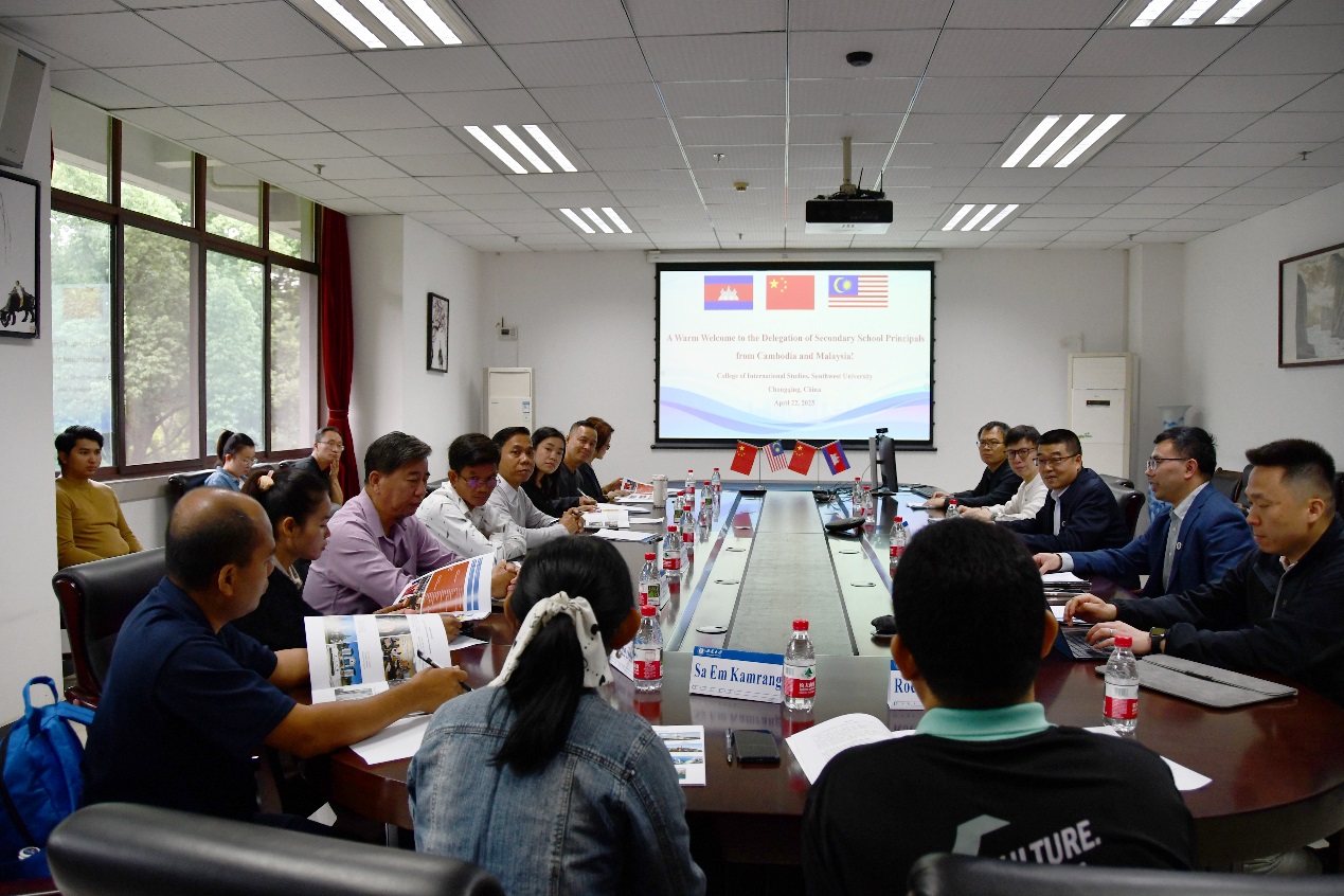 2025年4月22日,乘着习近平主席对柬埔寨、马来西亚成功访问的东风,两国基础教育界代表团一行11人跨海而来,与我院共商教育合作新篇。学院副院长张俊率英语教育系、英语系、社会发展中心及国际交流办公室负责人全程接待,双方围绕"一带一路"教育共同体建设展开深度对话。