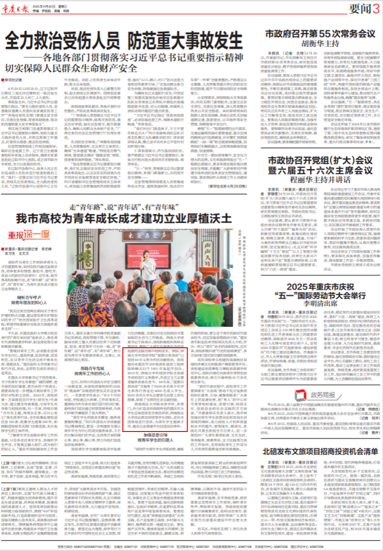 4月30日,重庆日报在《走“青年路”、说“青年话”、有“青年味” 我市高校为青年成长成才建功立业厚植沃土》的专题报道里,特意提及了“星期日英语班”,从侧面凸显了该班在高校服务社会、助力青年成长方面所发挥的重要作用。