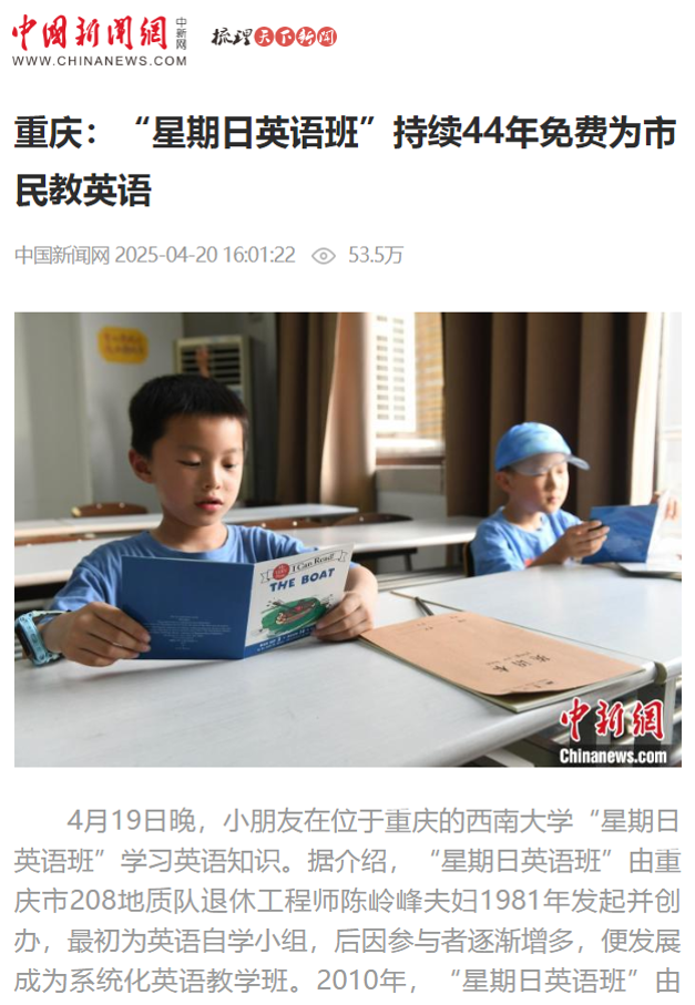 4月20日,中国新闻网紧跟步伐,以《重庆:“星期日英语班”持续 44 年免费为市民教英语》为题,将镜头聚焦于星期日英语班的教学现场。报道中,现场热烈的学习氛围、中外志愿者的积极参与,让读者深切感受到这一公益项目的活力与价值。