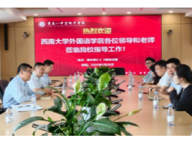 5月29日,张俊副院长一行4人到两江育才中学开展实习中期检查暨访企拓岗工作。两江育才中学杨赟书记发表了热情洋溢的欢迎致辞,高度评价双方长期合作在促进教育教学交流、协同培养优秀外语师资方面取得的成果。实习生代表颜赛男同学汇报实习进展情况,介绍实习生们在教学一线学习和成长的经历,总结在教学实践、班级管理等方面的进步与成长,并分享了实习生之间共同学习、共同进步、共同成长的体验。