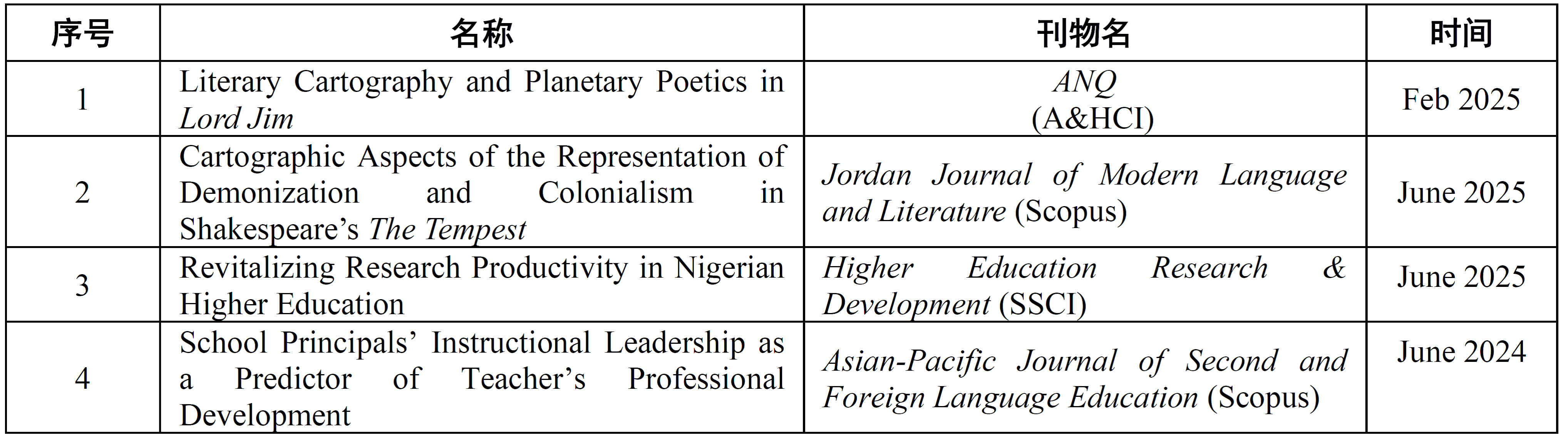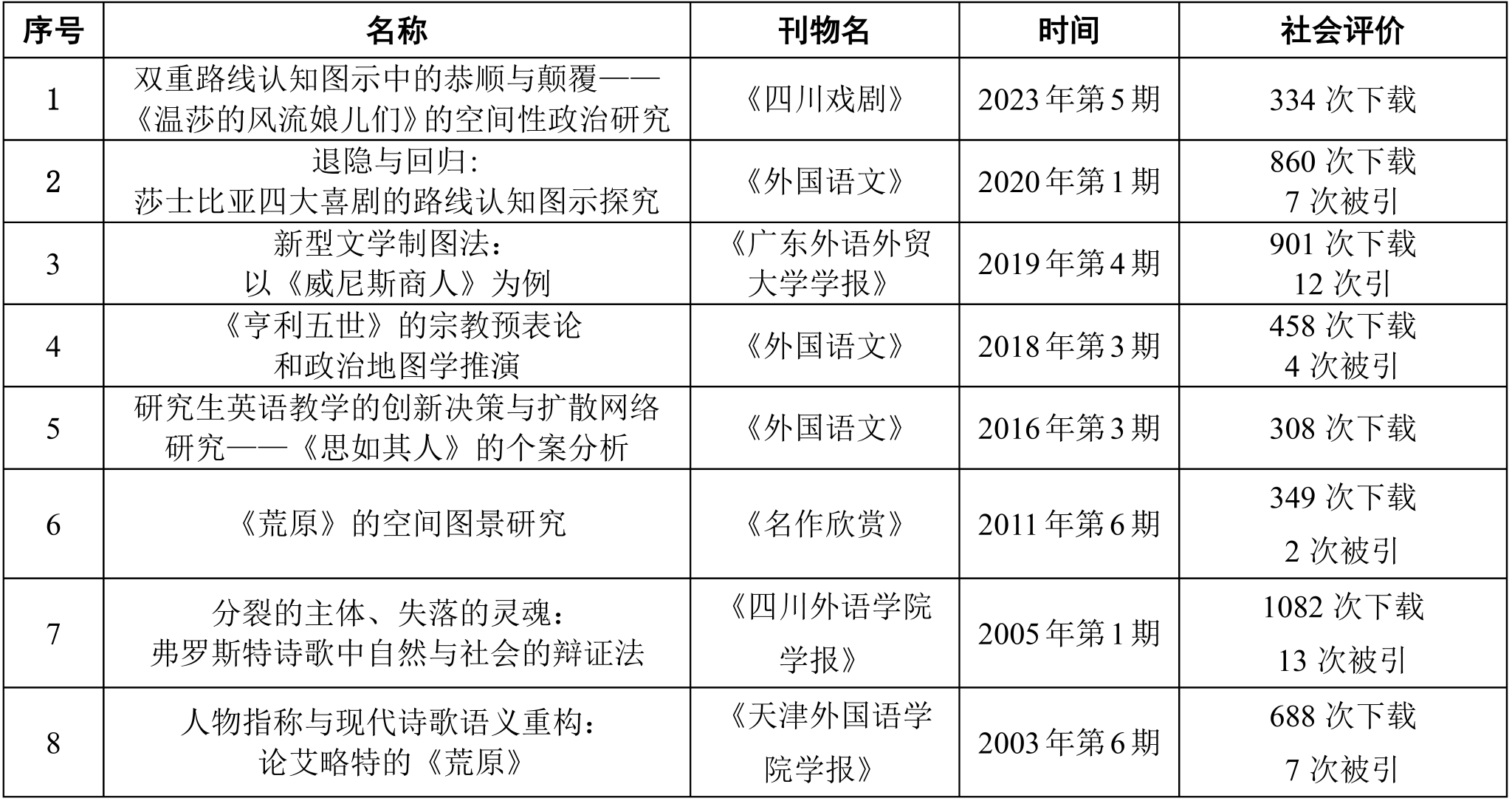 学术论文:英文学术论文8篇。其中核心期刊4篇(A&HCI论文1篇,SSCI论文1篇, Scopus论文2篇)详情如下: