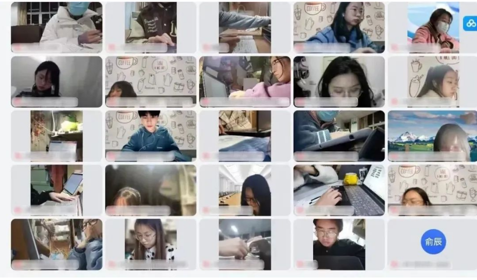 一、同学们通过“飞书”app进入自习室,打开摄像头认真学习。