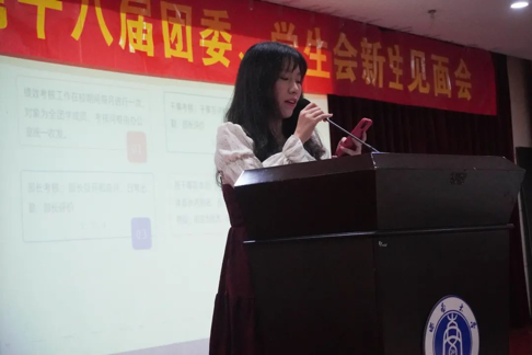 本次见面会分为五个环节:主席团成员介绍、各部门负责人介绍、执行主席周思妍给新生的一封信、团委副书记彭雅欣介绍团学制度、各部门合影。