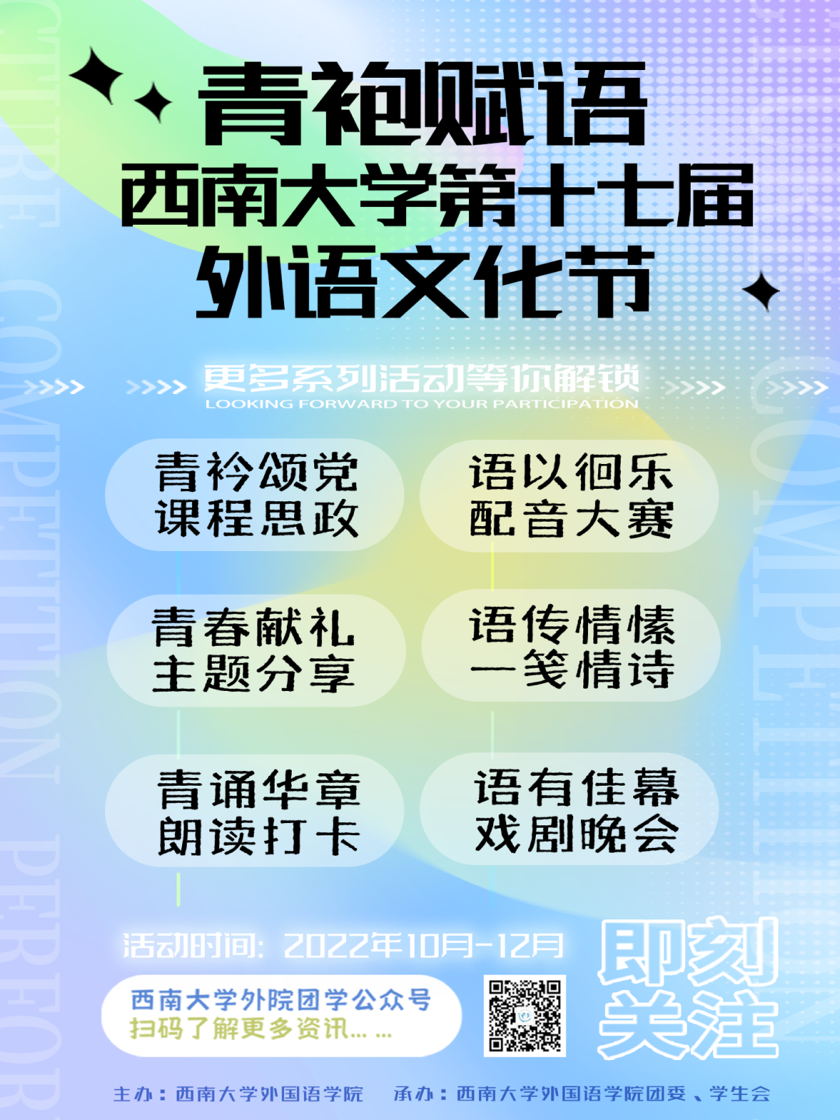 外院有你,青袍赋语。在西南大学党委学生工作部、共青团西南大学委员会以及76net必赢官网团委、学生会和全体师生的大力支持下,西南大学外语文化节自2003年创办至今收获好评无数。每一次的外文节都能带来全新的精彩和震撼,极大提升学生文化素养,助力校园文化建设。万众瞩目中,第十七届“青袍赋语”外语文化开幕啦!