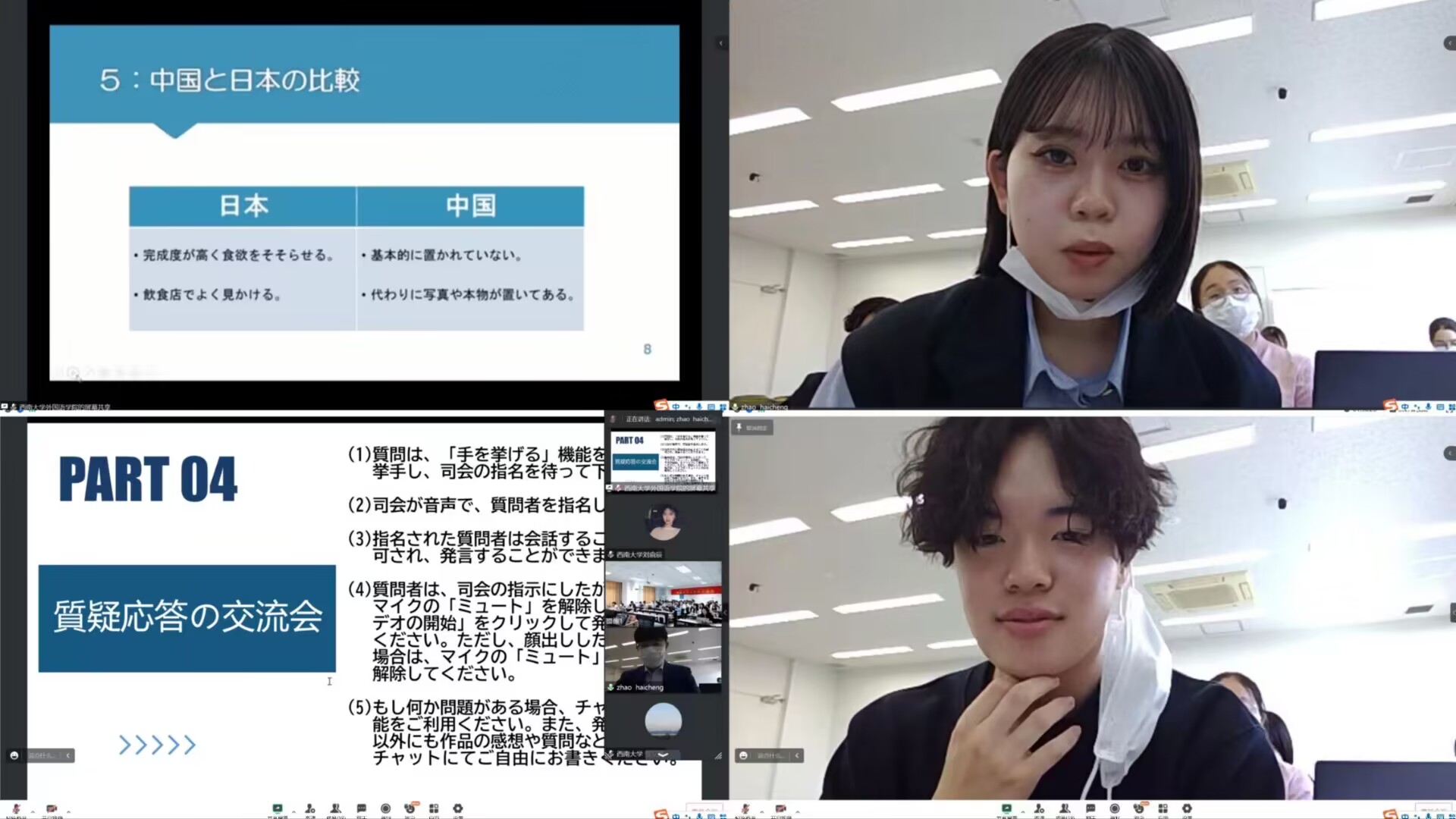 最后是交流答疑环节,中日双方大学生分别就对方国家的文化提出了自己的疑问,再相互解答对方疑问,进一步加深了中日两国大学生对两国文化的理解。