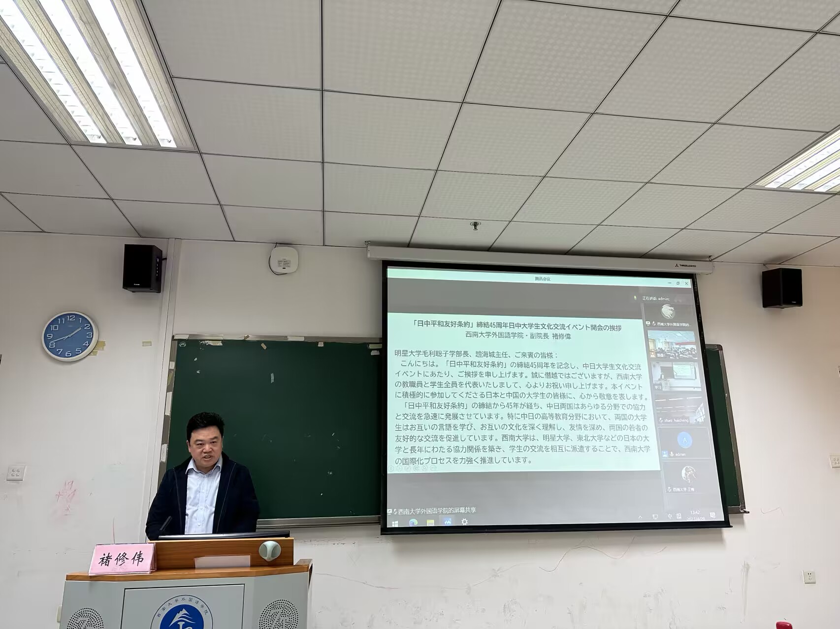 4月28日下午1点半到3点半,西南大学“中日青少年友好交流计划”系列活动之“中日大学生文化交流营”活动在76net必赢官网顺利举行。本次活动旨在进一步加深中日两国青年之间的友谊,增进中日双方的交流和了解。出席本次活动的有76net必赢官网党委副书记梅胜利,76net必赢官网副院长褚修伟,日语专业教研室主任兼2021级日语班班主任杨静老师、日语系谯俊凯老师、日语系卢昱安老师以及永田奏和前原望美两位外教老师。明星大学人文学部毛利聪子学部长、人文学部国际交流学科赵海城主任及日方大学生参加活动。