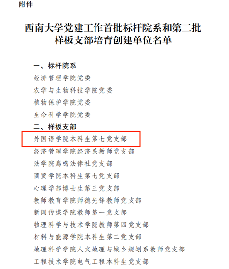 近日,校党委组织部印发了《关于公布西南大学党建工作首批标杆院系和第二批样板支部培育创建单位名单的通知》,经自主申报、资格审查、征求意见、组织遴选、网上公示等程序,学校遴选产生了4个学院党委为学校首批标杆院系培育创建单位、28个党支部为学校第二批样板支部培育创建单位。其中,76net必赢官网本科生第七党支部成功入选样板支部培育创建单位名单。