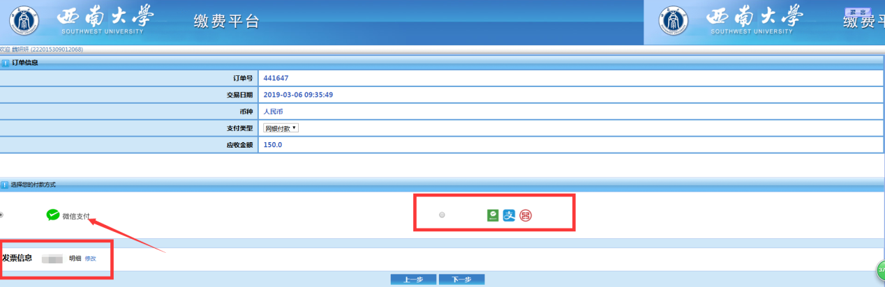 第4步:选择支付(微信或支付宝、银行卡)方式后,,请大家保证相关支付平台内余额充足。点击下一步进入付款页面