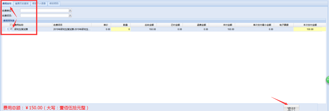 第2步:点击左上方“费用支付”界面,在费用项列表内选中(打勾)“研究生复试费”,点击右下方“支付按钮”。