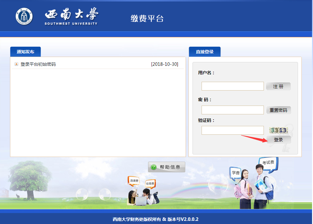 第1步:登录网上缴费平台(http://upay.swu.edu.cn/payment/login.jsp),用户名、初始密码为身份证号,输入验证码后,点击“登录”按钮。