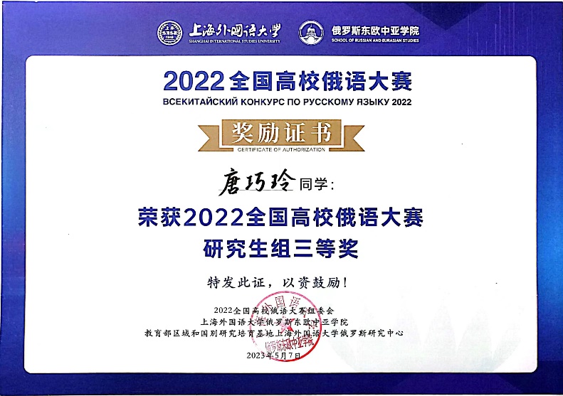 为深入学习贯彻习近平新时代中国特色社会主义思想,持续推进我国与欧亚地区国家及上海合作组织框架下的教育交流合作,着力培养“讲好中国故事”的俄语人才,由教育部国际合作与交流司主办、上海外国语大学承办的2022全国高校俄语大赛复决赛于2023年5月6日至7日在上海外国语大学松江校区成功举办。我院俄语系2022级研究生唐巧玲同学荣获研究生组三等奖。