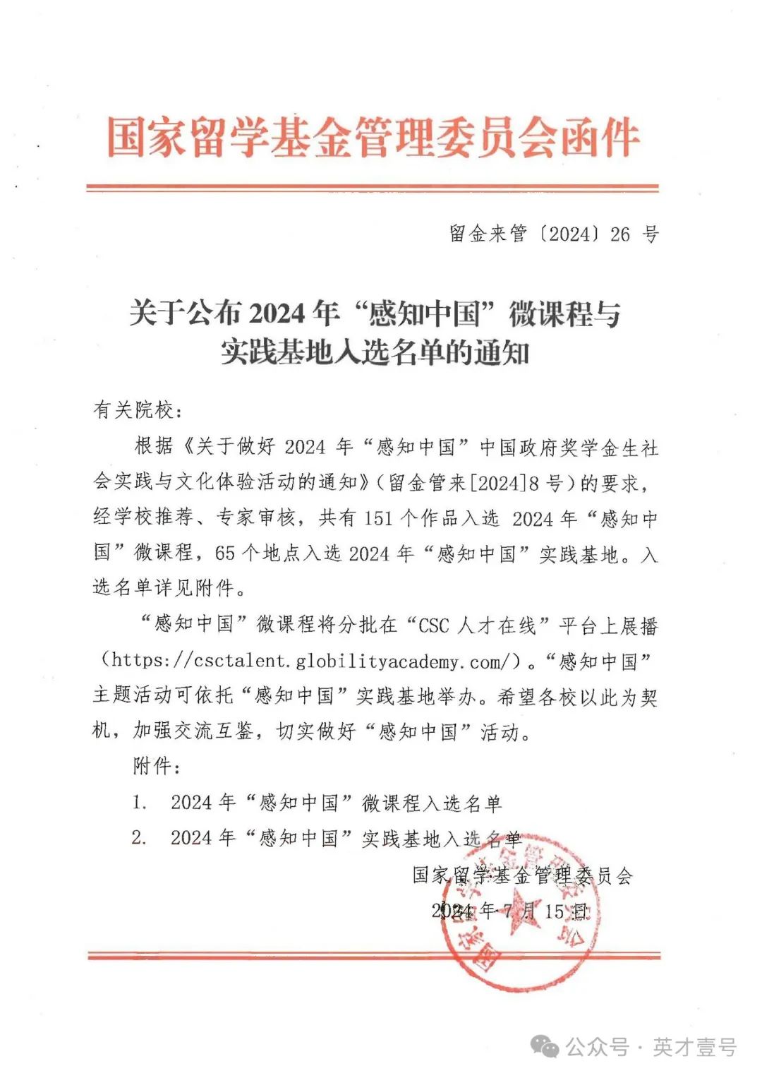据悉,“感知中国”微课程是国家留学基金委为贯彻落实党的二十大精神和习近平总书记给在华留学生多次回信精神,于近年组织的“感知中国”中国政府奖学金生社会实践与文化体验活动的一部分。留学基金委面向全国征集“感知中国”微课程,建设课程库和讲师团,为各校来华留学国情教育提供可借鉴的课程范例。入库作品将在“CSC人才在线”培训平台展播,入库教师将纳入“感知中国”讲师团。