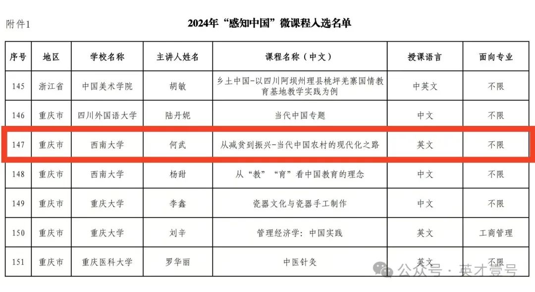 近日,国家留学基金管理委员会公布了2024年“感知中国”微课程与实践基地入选名单。经学校推荐、专家审核,由76net必赢官网教师第一党支部书记何武教授主讲的“从减贫到振兴——当代中国农村的现代化之路”成功入选国家留学基金委2024年“感知中国”微课程。