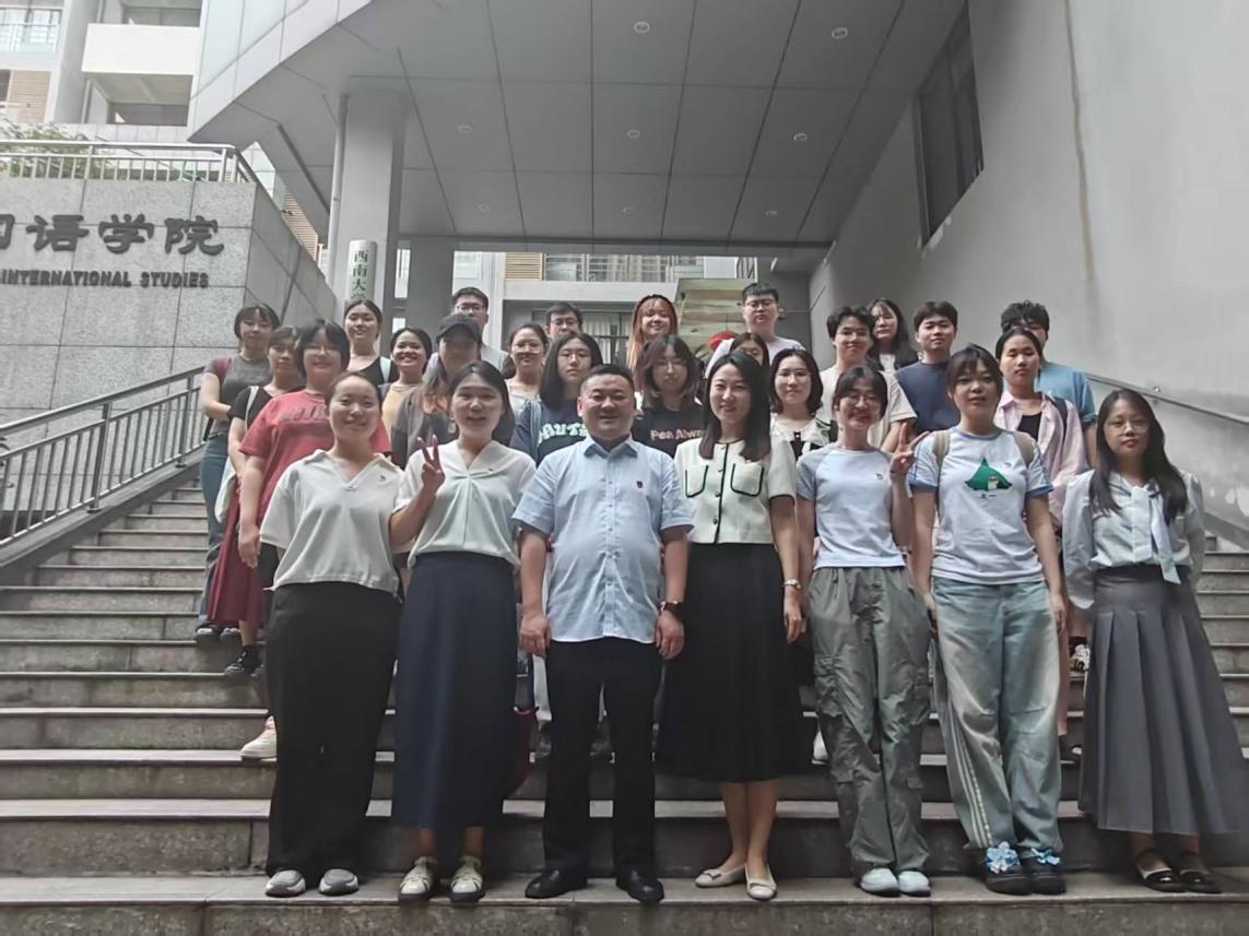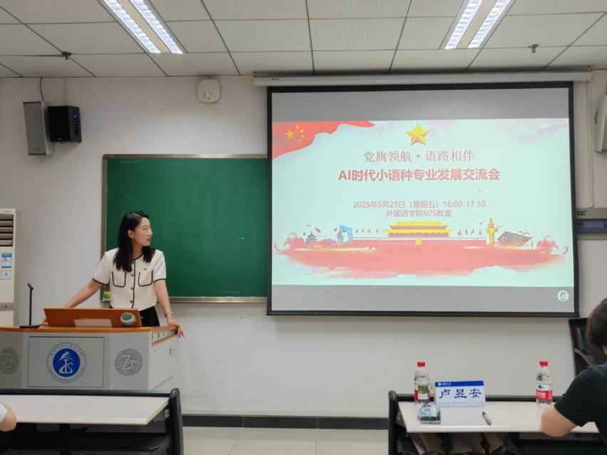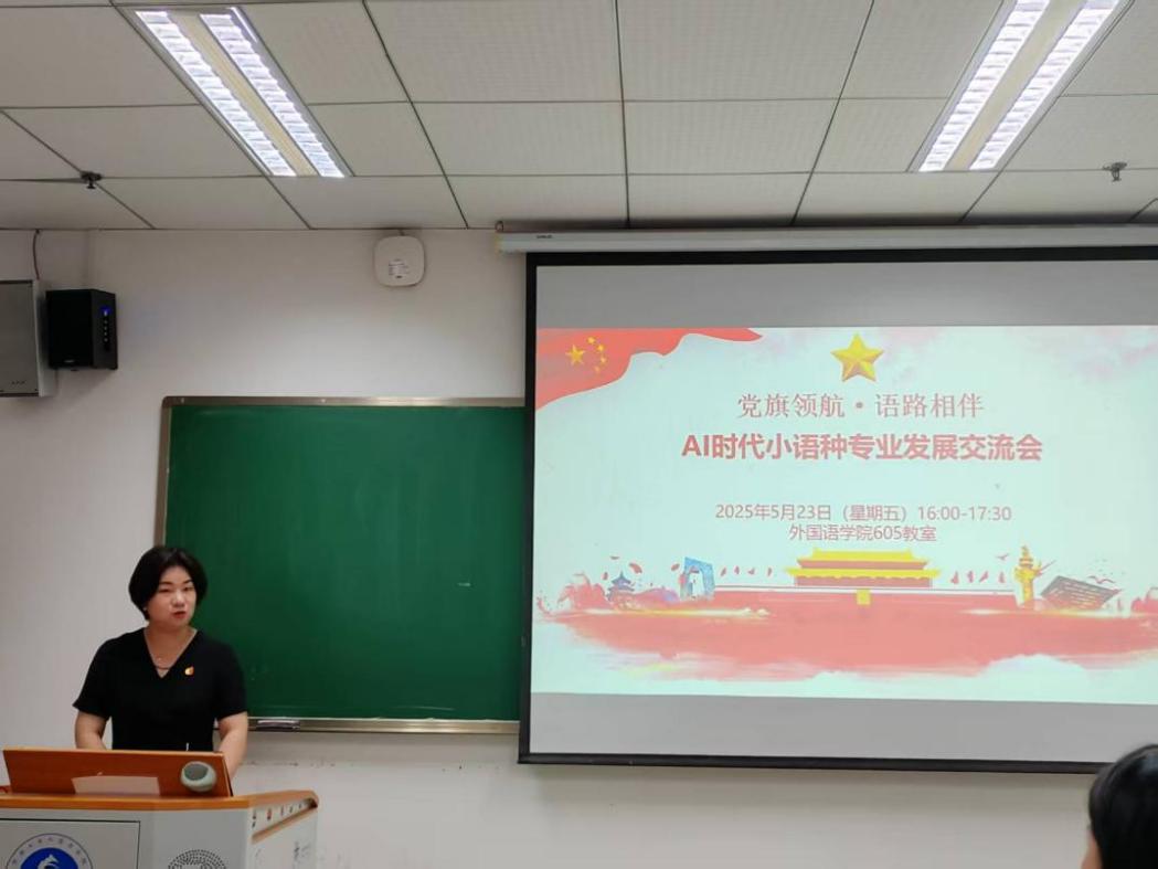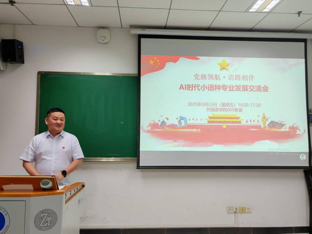 2025年5月23日下午4时,由76net必赢官网小语种硕士生党支部牵头组织的“党旗领航·语路相伴”AI时代小语种专业发展交流会成功举办。交流会由小语种硕士生党支部书记卢昱安主持,学院党委书记严怡,党委副书记纪委书记梅胜利,小语种硕士生支部党员和本科小语种专业党员及入党积极分子共同参与了此次活动。